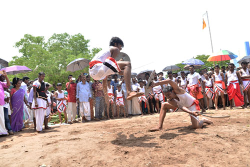 Sticks, swords and shields are the weapons of the warriors. The war fighters spend hours in fight with the enemy warriors in the muddy fields.”THEE = THEE-THEAI: is the sound slogan of the players.